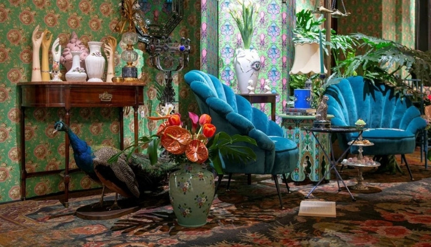 • İmza Desenler: Gucci’nin maksimalist bitki ve hayvan motifleri, bir ceketten çıkıp duvar kağıdı olarak karşımıza çıkıyor.
